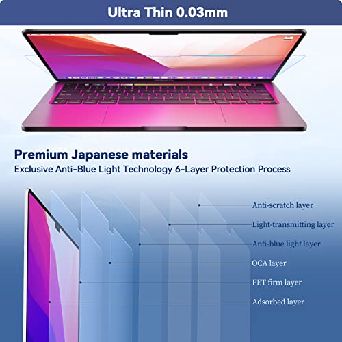 • 【Puissante fonction anti-lumière bleue】Protection écran Macbook air m2 adopte la dernière technologie de filtrage de la lumière bleue, et son taux de blocage de la lumière bleue nocive atteint 99,3 %. Si vous craignez toujours que la lumière bleue provoque de l’insomnie, des maux de tête, des yeux secs et une vision floue, c’est une excellente option pour réduire la fatigue oculaire.