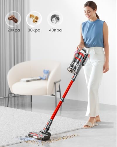- 【40Kpa/500W Forte Aspiration】L’balai aspirateur sans fil à double poignée le plus récent de 2024, équipé d’un moteur de 500W, peut générer une puissante aspiration allant jusqu’à 40Kpa. Il élimine facilement les débris et les croquettes sur les sols, les poils et la poussière sur les tapis, ainsi que les coins difficiles à nettoyer, les endroits sombres, les murs et les hauteurs. Doté d’un traitement de réduction du bruit (bruit