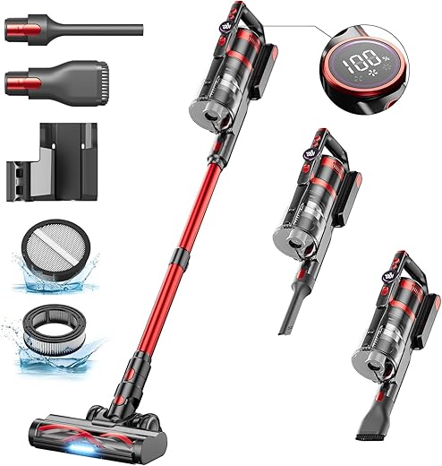 - 【Brosse V Améliorée & Sept-en-Un】Cet aspirateur sans fil puissant est équipé d’un nouveau rouleau de brosse en forme de V, doté d’une tête de brosse flexible à 270°, combinant poils souples et durs, brosses en V rotatives et brosses en peigne, ainsi qu’un moteur 5C pour une meilleure pénétration de l’air et une réduction des enchevêtrements de cheveux. Le tube télescopique sept-en-un est fourni avec divers accessoires, augmentant l’efficacité du nettoyage et facilitant le nettoyage des portes, des interstices des canapés et des rebords de fenêtres.