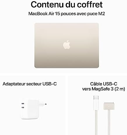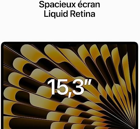- GRAND ÉCRAN SPECTACULAIRE – L’écran Liquid Retina haute résolution de 15,3 pouces offre 500 nits de luminosité, une large gamme de couleurs P3 ainsi que la prise en charge d’un milliard de couleurs pour des images éclatantes et un niveau de détail impressionnant. (L’écran du MacBook Air 15 pouces présente des angles arrondis au sommet. Si l’on mesure cet écran comme un rectangle, sa diagonale fait 15,3 pouces ; la zone d’affichage réelle est moindre.)