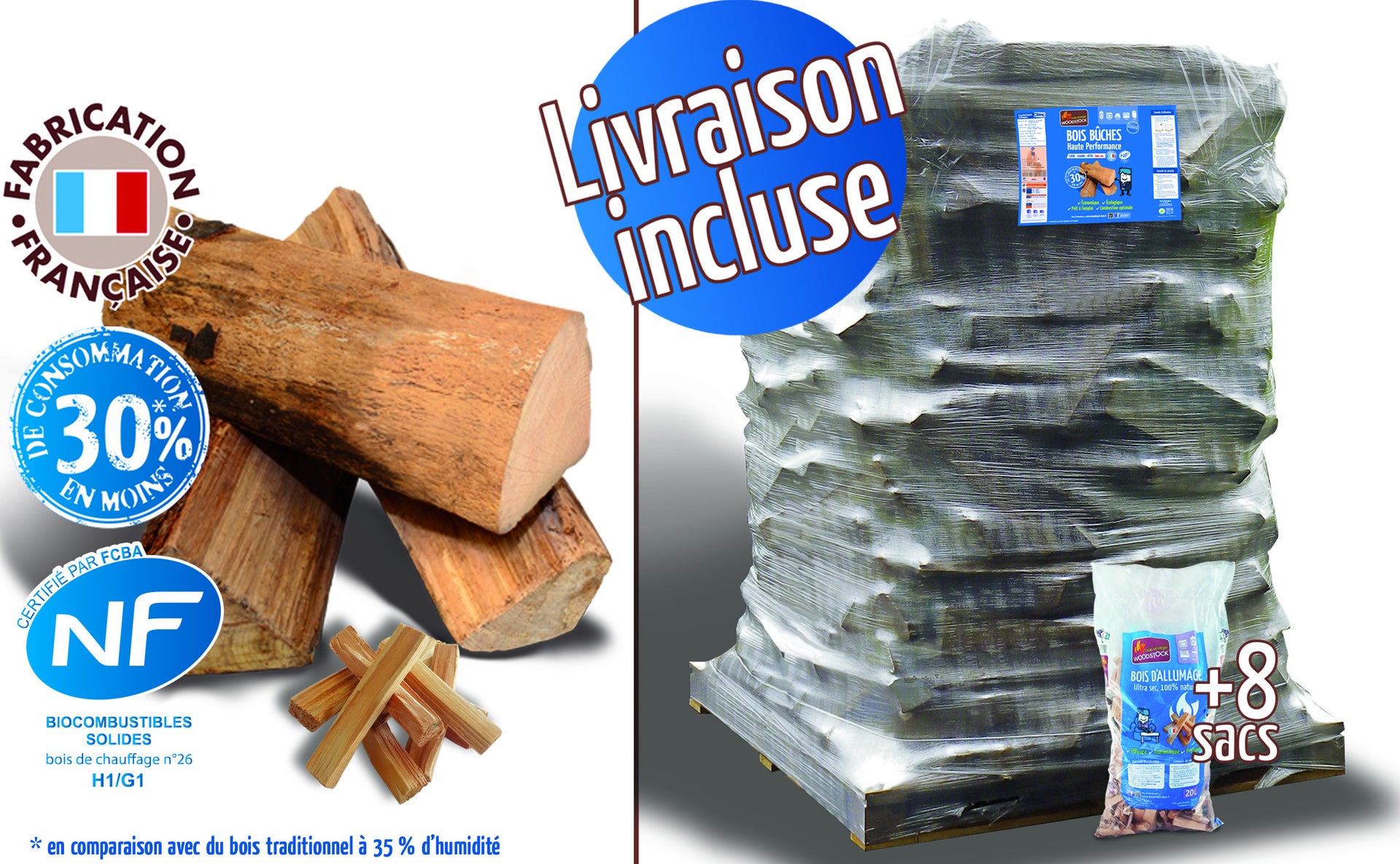 Bûches 40 cm, 1.66m³, 2.25 stères + 8 sacs bois d’allumage