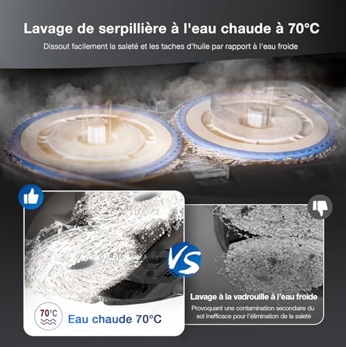 En plus d’une aspiration puissante, le Deebot T30 utilise deux vadrouilles qui se nettoient à l’eau chaude. Cela garantit un nettoyage hygiénique et en profondeur des sols. Les vadrouilles restent propres en permanence grâce à cette fonctionnalité, éliminant efficacement les taches et la saleté incrustée. De plus, la gestion séparée de l’eau propre et de l’eau sale est très pratique. Elle évite toute contamination croisée, assurant que les sols sont toujours nettoyés avec de l’eau propre.