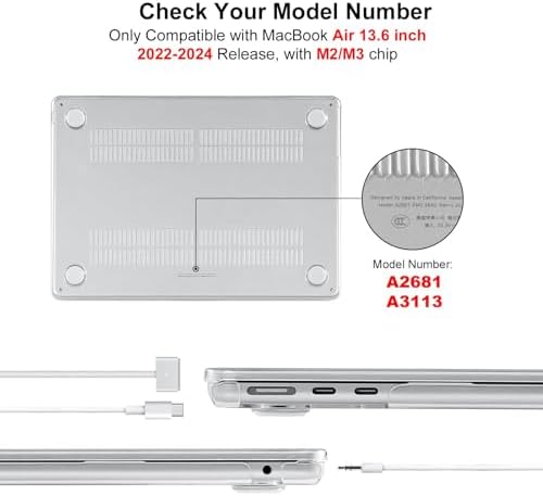 • ✔ Compatible uniquement avec 2024 2022 Macbook Air 13,6 pouces M2 M3 avec Touch ID (Modèle: A2681, A3113, Sorti en 2022 2024 ). Veuillez vérifier le modèle de Macbook “AXXXX” au dos avant d’acheter. Non compatible avec d’autres modèles de Macbook. Protection macbook air m2, air m3.