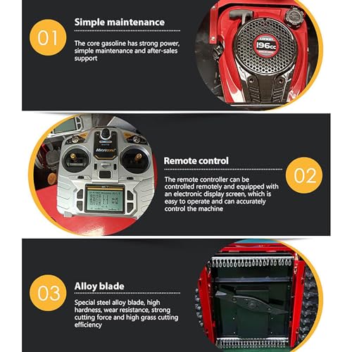 • ★SÉCURITÉ – La tondeuse peut être utilisée jusqu’à 200 mètres de distance VIA la télécommande. Notre bielle hydraulique récemment améliorée la maintient stable lorsqu’elle tond sur une pente, augmentant encore davantage la sécurité sur des pentes raides allant jusqu’à 45 degrés.