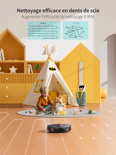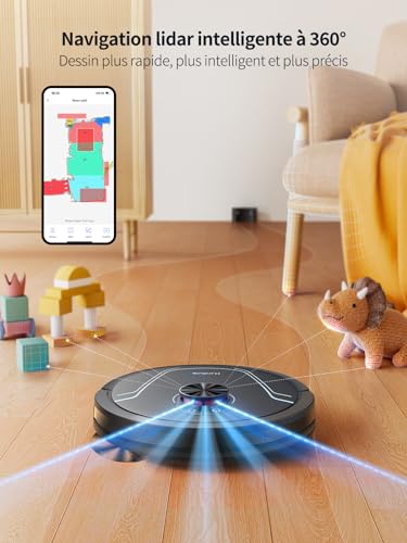 • 💎【𝐍𝐚𝐯𝐢𝐠𝐚𝐭𝐢𝐨𝐧 𝐋𝐢𝐝𝐚𝐫 𝐝𝐞 𝐏𝐫é𝐜𝐢𝐬𝐢𝐨𝐧】Grâce au radar LDS amélioré et à l’algorithme SLAM, l’aspirateur robot V8 Pro est 2 fois plus rapide et précis qu’un robot normal, il ne prend que 8 minutes pour cartographier une pièce, identifier intelligemment les meubles, trouver automatiquement le meilleur itinéraire pour nettoyer la maison, nettoyer plus efficacement.
