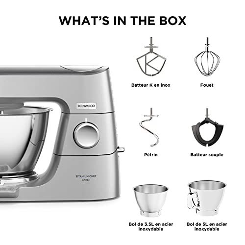 10 avis pour Kenwood Titanium Chef Baker KVC85.004SI Robot Patissier avec Balance Intégrée, Inclus Ensemble Pâtisserie 3 Pièces, Bol de Mélange de 5L et 3.5L, Régulateur de Vitesse…