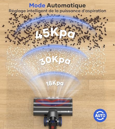 • 【Contrôle intelligent des performances de nettoyage】 Aspirateur balai sans fil ajuste intelligemment la teneur en poussière et en saleté grâce à son réglage automatique de la puissance d’aspiration pour obtenir des résultats de nettoyage optimaux et une durée de fonctionnement prolongée