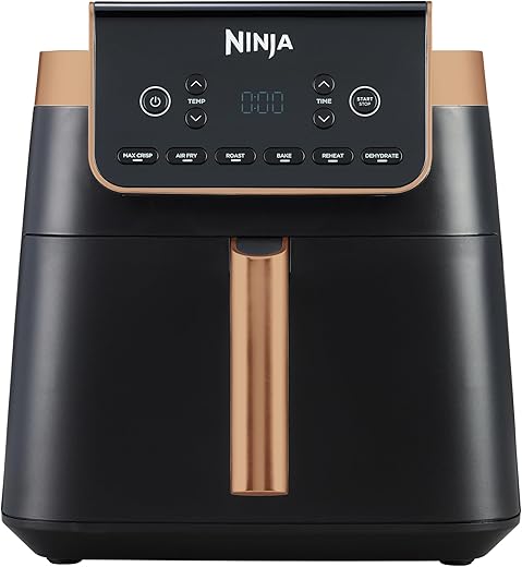 - INCLUS : Ninja Air Fryer Single Drawer (Prise EU), Panier de 6,2 L antiadhésif et lavable au lave-vaisselle et Plaque de cuisson réglable, Pinces en silicone. Guide de recettes créées par des chefs. Couleur : Noir/Cuivre