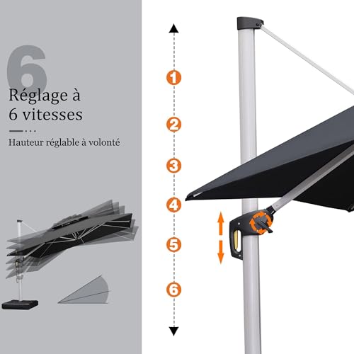 - Ce parasol déporté est doté d’une poignée unique et d’un système de manivelle avec 6 options de hauteur et d’angle et une rotation de 360 degrés pour un contrôle facile de la zone d’ombre