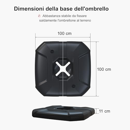 - Equipé d’une base lestée de 145 kg pour offrir une meilleure stabilité au parasol. La base est fabriquée à partir de plastique HDPE durable, hautement résistant aux chocs, aux UV et stable