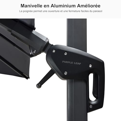 - Le fonctionnement du parasol est très simple. Équipé d’une manivelle, il peut être facilement relevé et abaissé. Tourner la poignée permet d’incliner et de faire pivoter le parasol des deux côtés