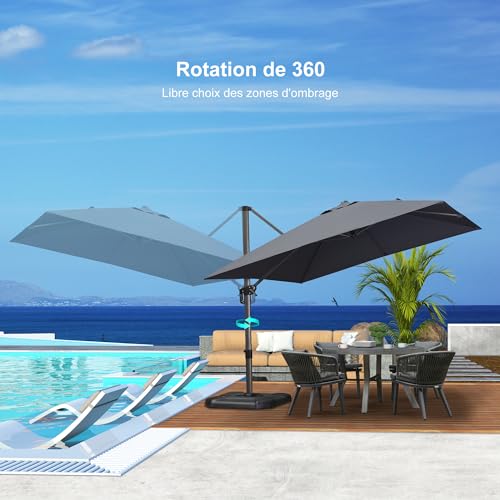• Afin de répondre à vos besoins d’ombrage dans différentes conditions de lumière et de météo, le parasol PURPLE LEAF est conçu pour pivoter à 360°. Vous pouvez le tourner dans différentes directions, et il dispose également de 5 hauteurs et angles au choix pour offrir un ombrage complet