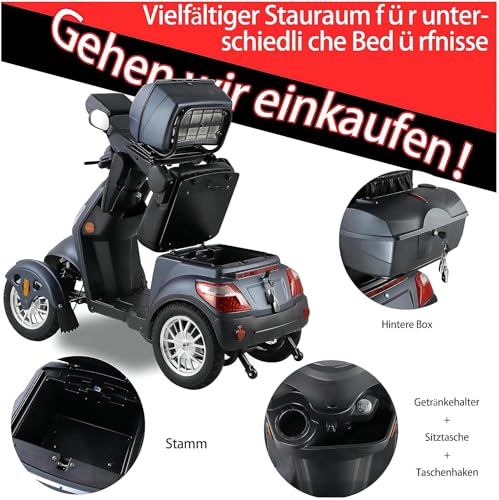 Scooter électrique à 4 roues avec 3 vitesses, grand espace de stockage, tête et accoudoirs réglables et dossier. Convient pour différents terrains avec phares, feux arrière et…