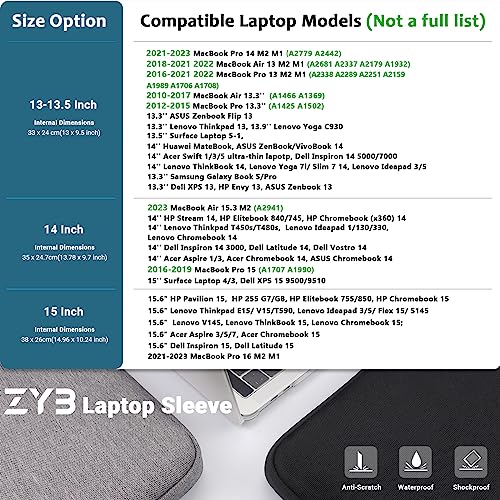 • [Produit Spécifications ]:1 X ZYB Housse Ordinateur 13,5 Pouces [Dimensions intérieures:33 x 24 x 2,3 cm] (13 x 9,5 x 0,9 pouces). Offre une protection pour Laptop/MacBook Air/Pro 13, MacBook PRO 14. La ZYB pochette 13-13.5 pouces pc portable convient également aux ultrabooks 13,9 à 14 pouces : 13,9 pouces Lenovo Yoga C930, 14 pouces Lenovo Flex 5 et Lenovo Yoga C740, Huawei Matebook D 14, ASUS ZenBook / Vivobook 14.